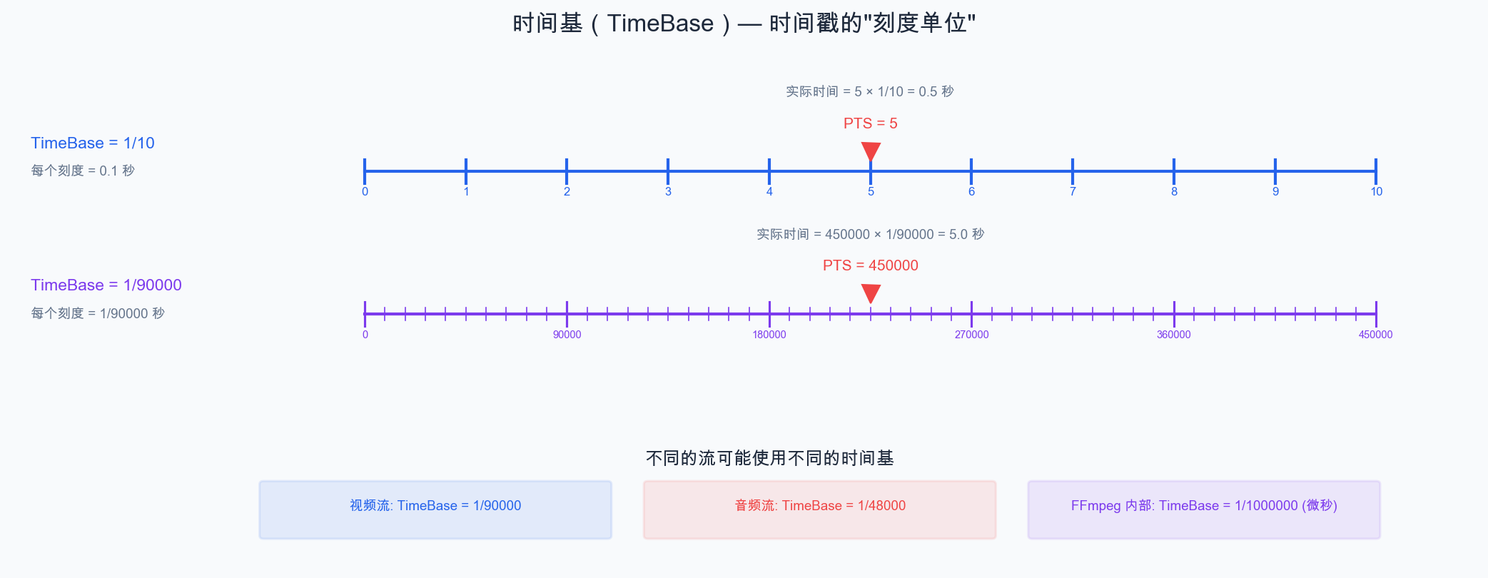 时间基定义了时间戳的单位。它是一个分数,表示每个时间刻度代表多少秒。