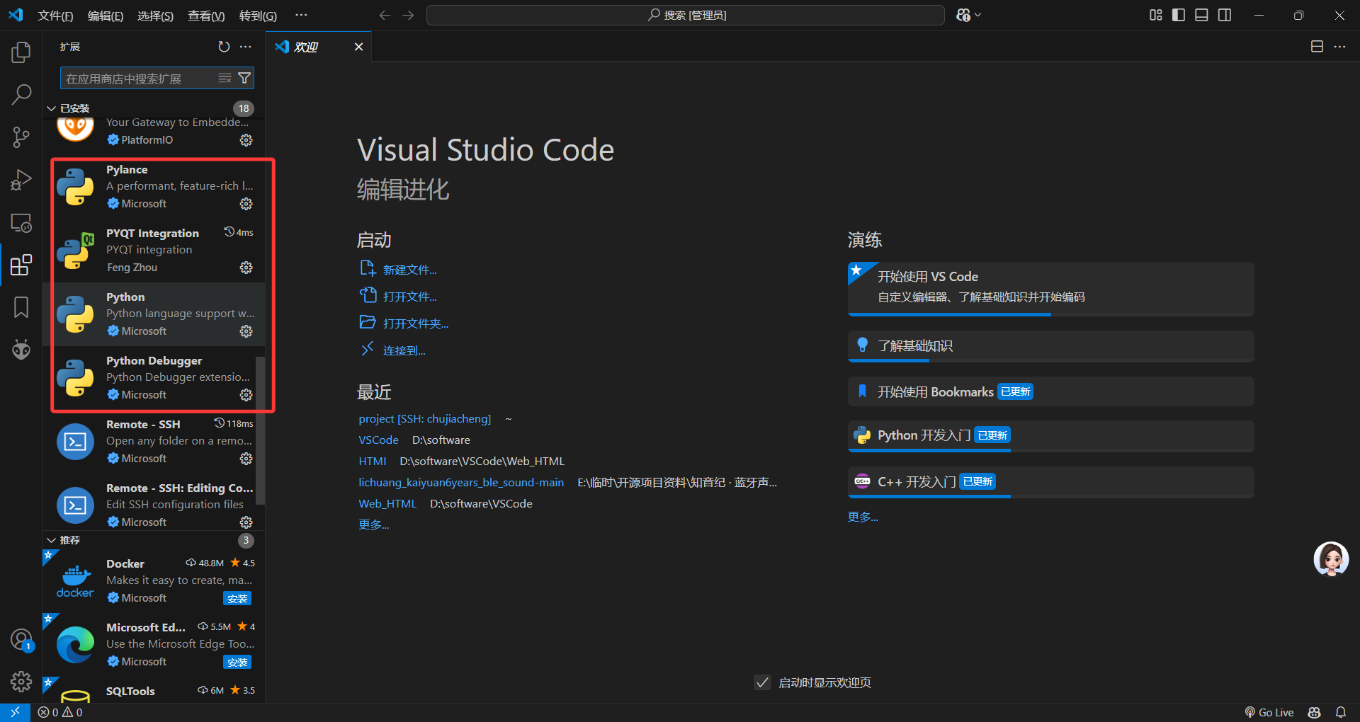 2.打开VS Code → 左侧【扩展】栏(快捷键:Ctrl+Shift+X)→ 搜索→ 选择微软官方插件→ 点击【安装】。