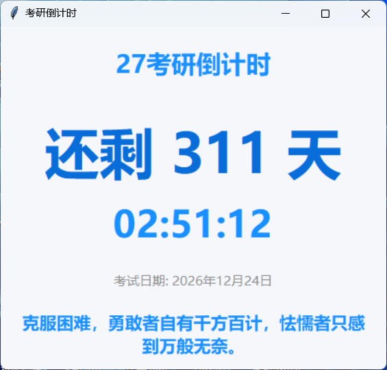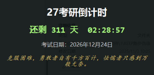 pythonimport tkinter as tk from datetime import datetime # ------------------ 配置参数 ------------------ TARGET_DATE = datetime(2026, 12, 24, 0, 0, 0) # 考研日期(当天0点) TITLE_TEXT = "27考研倒计时" DATE_TEXT = "考试日期:2026年12月24日" MOTTO_TEXT = "克服困难,勇敢者自有千方百计,怯懦者只感到万般无奈。" # 颜色与字体 BG_COLOR = "#0a0f0f" # 深色背景 FG_TITLE = "#ffffff" FG_COUNTDOWN = "#a3ff73" # 亮绿色 FG_DATE = "#cccccc" FG_MOTTO = "#ffd966" # 柔和黄色 FONT_TITLE = ("微软雅黑", 20, "bold") FONT_COUNTDOWN = ("Consolas", 18, "bold") # 等宽字体,保持宽度稳定 FONT_DATE = ("微软雅黑", 12) FONT_MOTTO = ("楷体", 13, "italic") # 窗口透明度 (0~1) WINDOW_ALPHA = 0.92 # 右下角边距 MARGIN_RIGHT = 30 MARGIN_BOTTOM = 50 # ------------------ 功能函数 ------------------ def update_countdown(): """更新时间显示""" now = datetime.now() delta = TARGET_DATE - now if delta.total_seconds() < 0: # 考试已过或已开始 countdown_label.config(text="🏁 考研已开始,加油! 🏁") return # 停止刷新 else: days = delta.days seconds = delta.seconds hours = seconds // 3600 minutes = (seconds % 3600) // 60 secs = seconds % 60 # 格式:还剩 XXX天 HH:MM:SS time_str = f"还剩 {days} 天 {hours:02d}:{minutes:02d}:{secs:02d}" countdown_label.config(text=time_str) # 每秒调用自己 root.after(1000, update_countdown) def start_move(event): """记录拖动起点""" root.drag_start_x = event.x root.drag_start_y = event.y def do_move(event): """窗口拖动""" deltax = event.x - root.drag_start_x deltay = event.y - root.drag_start_y x = root.winfo_x() + deltax y = root.winfo_y() + deltay root.geometry(f"+{x}+{y}") def quit_app(event): """右键退出程序""" root.destroy() # ------------------ 创建窗口 ------------------ root = tk.Tk() root.title("考研倒计时") # 任务栏显示,但会被覆盖 root.overrideredirect(True) # 去掉窗口边框 root.attributes('-topmost', True) # 始终置顶 root.attributes('-alpha', WINDOW_ALPHA) # 透明度 root.configure(bg=BG_COLOR) # ------------------ 放置控件 ------------------ # 使用Frame作为容器,方便统一背景和内边距 main_frame = tk.Frame(root, bg=BG_COLOR) main_frame.pack(padx=15, pady=12) # 标题 title_label = tk.Label(main_frame, text=TITLE_TEXT, font=FONT_TITLE, fg=FG_TITLE, bg=BG_COLOR) title_label.pack(pady=(0, 8)) # 倒计时(核心,会动态更新) countdown_label = tk.Label(main_frame, text="正在计算...", font=FONT_COUNTDOWN, fg=FG_COUNTDOWN, bg=BG_COLOR) countdown_label.pack(pady=5) # 考试日期 date_label = tk.Label(main_frame, text=DATE_TEXT, font=FONT_DATE, fg=FG_DATE, bg=BG_COLOR) date_label.pack(pady=5) # 励志名言(自动换行,宽度约400像素) motto_label = tk.Label(main_frame, text=MOTTO_TEXT, font=FONT_MOTTO, fg=FG_MOTTO, bg=BG_COLOR, wraplength=400, justify="center") motto_label.pack(pady=8) # ------------------ 绑定事件 ------------------ root.bind('<Button-1>', start_move) # 左键按下记录位置 root.bind('<B1-Motion>', do_move) # 左键移动拖动窗口 root.bind('<Button-3>', quit_app) # 右键退出程序 # 为了让所有区域都能拖动和退出,给所有子控件也绑定相同事件(可选) for widget in (title_label, countdown_label, date_label, motto_label): widget.bind('<Button-1>', start_move) widget.bind('<B1-Motion>', do_move) widget.bind('<Button-3>', quit_app) # ------------------ 窗口初始位置(右下角) ------------------ root.update_idletasks() # 更新控件布局,获取真实宽高 win_width = root.winfo_width() win_height = root.winfo_height() screen_width = root.winfo_screenwidth() screen_height = root.winfo_screenheight() x = screen_width - win_width - MARGIN_RIGHT y = screen_height - win_height - MARGIN_BOTTOM root.geometry(f'+{x}+{y}') # ------------------ 启动倒计时刷新 ------------------ update_countdown() # ------------------ 进入消息循环 ------------------ root.mainloop()