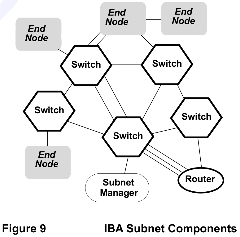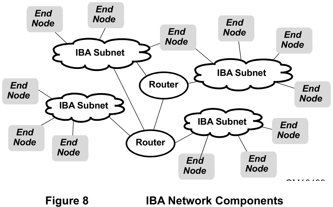 如下图所示。一个IBA网络可以拆分成数个子网,每个子网通过路由器连接。终端节点可以连接到单个子网或多个子网。