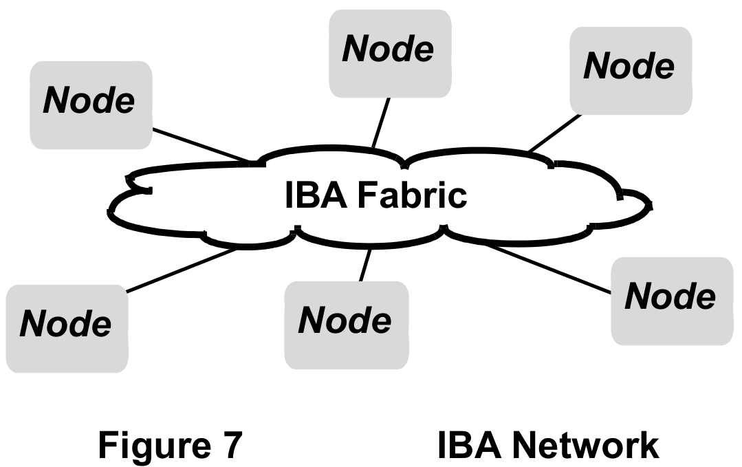 从高层架构来看,IBA充当着终端节点之间的互联网络,如下图所示。每个节点可以是处理器节点、I/O单元,和/或连接其他网络的路由器。