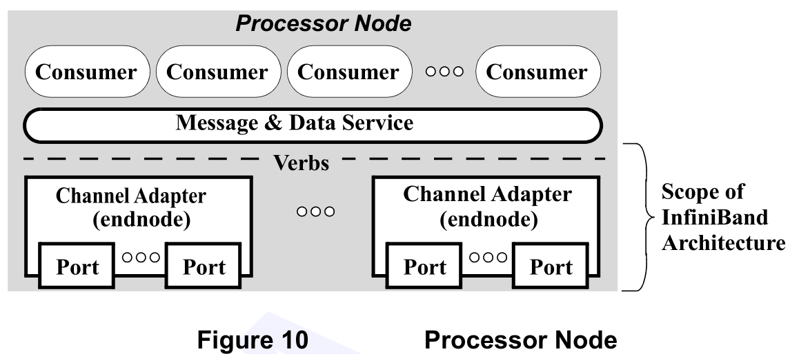 如下图所示,IBA架构针对多个独立进程和线程(消费者)进行了优化。每个通道适配器(Channel Adapter,可以理解成网卡)构成网络结构中的一个节点。IBA架构支持每个处理器节点(Processor Node)配备多个通道适配器,每个通道适配器提供一个或多个连接至网络结构的端口。在此配置下,处理器节点在网络结构中呈现为多个终端节点。