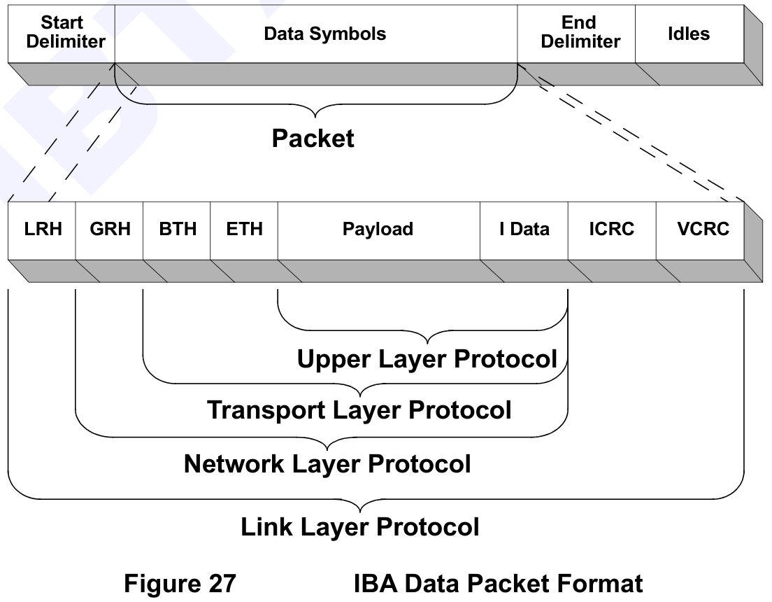 IBA架构协议栈可分为5层,分别是上层协议(Upper Level Protocols)、传输层(Transport Layer)、网络层(Network Layer)、链路层(Link Layer)和物理层(PHY Layer)。
