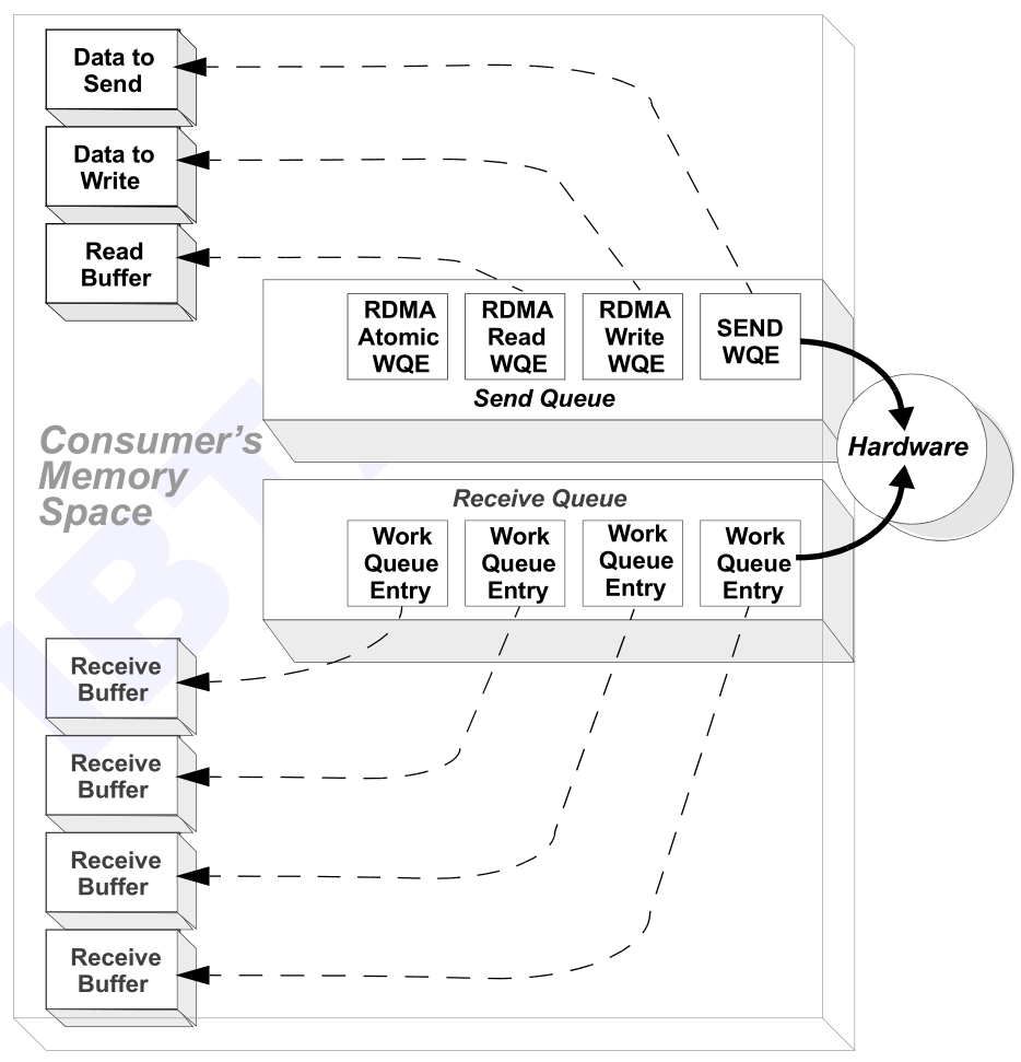 IBA操作的基础是其异步特性。软件异步提交请求,硬件异步执行,硬件执行完毕后通知软件执行结果,然后软件进行处理。软件和硬件通过WQ(Work Queue)和CQ(Completion Queue)交互。WQ通常成对创建,称为QP,一个用于发送操作,一个用于接收操作。WQ中存放了多个WQE(Work Queue Element),WQE中保存了数据传输地址、长度等信息。软件提交一个WR(Work Request)时,会在WQ中会创建一个WQE。硬件从WQ中依次取出WQE执行,执行完毕后会在CQ中产生一个CQE(Completion Queue Element),软件依次从CQ中取出CQE进行处理,CQE中保存了对应执行完成WQE的信息。