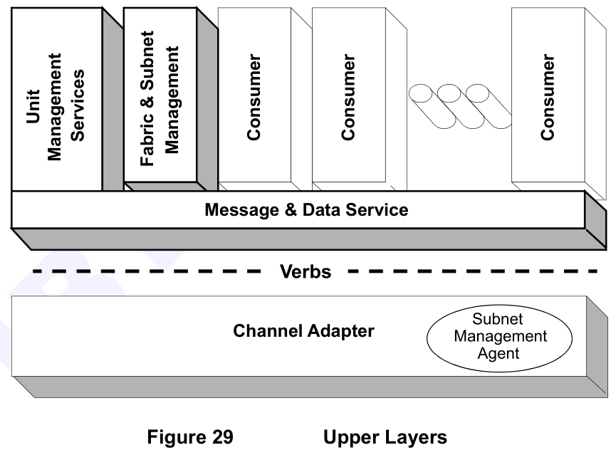IBA架构通过各类用户消费者支持多种上层协议。如子网管理协议、子网服务协议、通用服务等。IBA还针对特定管理功能定义了相应的消息与协议。这些协议通过Message承载,软件通过操作原语Verbs和硬件通道适配器交互。
