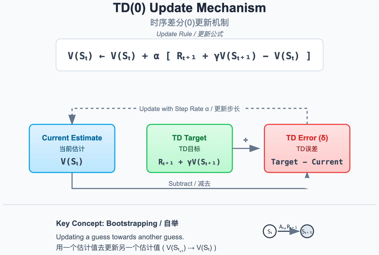 - 这就是 Bootstrapping(自举):用估计值更新估计值。