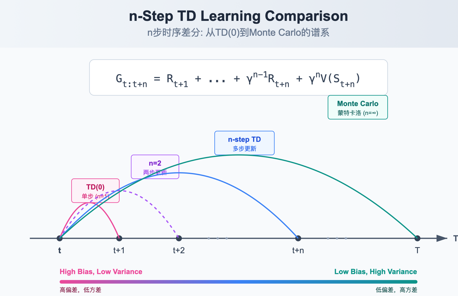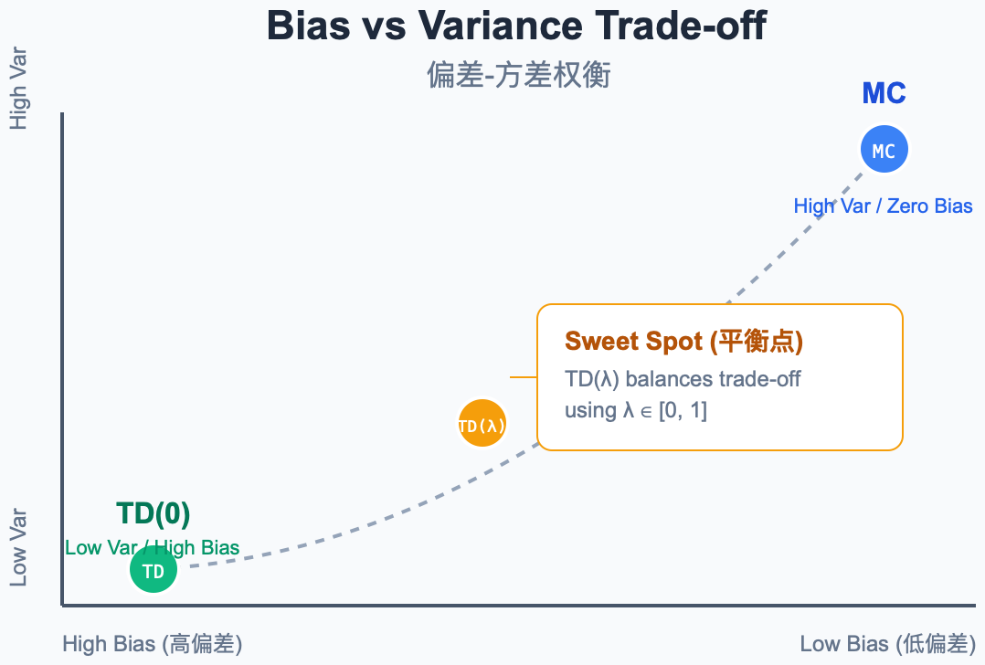 - MC 端 (高方差,零偏差):使用真实回报,无偏但受轨迹随机性影响大。