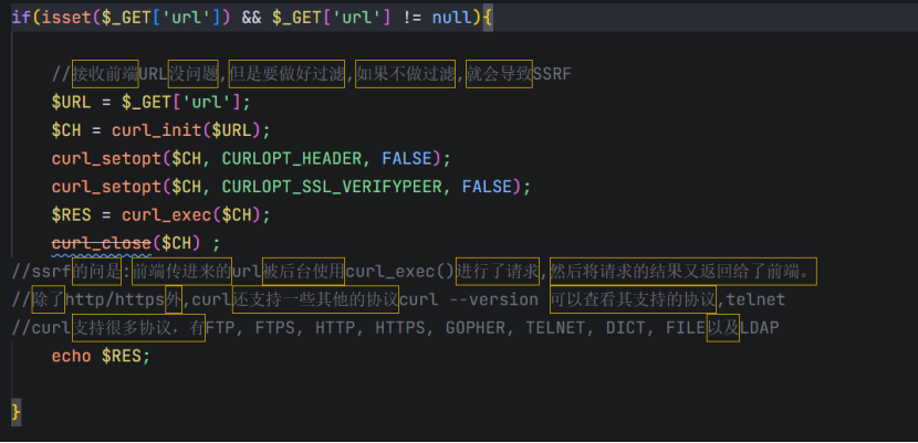 直接信任用户输入:代码直接获取 $_GET['url'] 参数,没有做任何验证和过滤,就交给 curl_exec() 去执行请求。