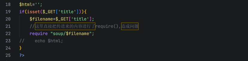 程序直接将$_GET['title']的值拼接到soup/后,然后通过require包含文件