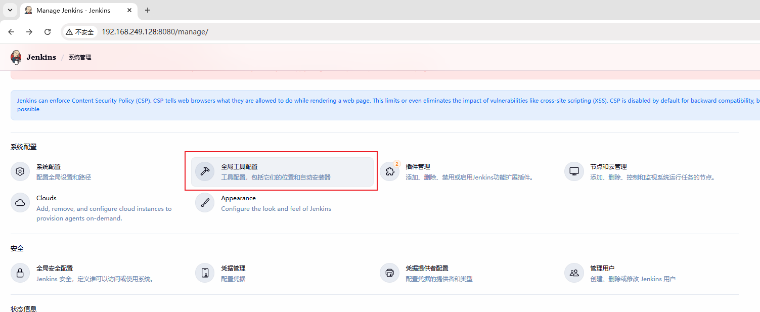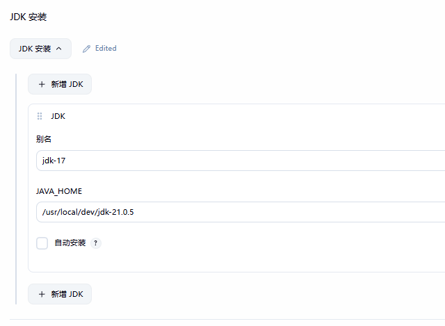 Jenkins 搭建完成,需配置 Maven、Git、JDK。在 全局工具配置 中,如下,