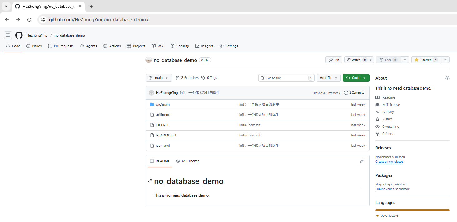 以上配置完成,可以开始构建项目,以 Github 上的这个代码仓库(https://github.com/HeZhongYing/no_database_demo)为例。