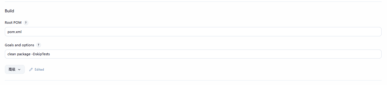 配置完 Git,现在构建就能拉代码。接着对 Maven 进行配置,构建时使用 pom.xml 文件,执行 clean package -DskipTests 命令。