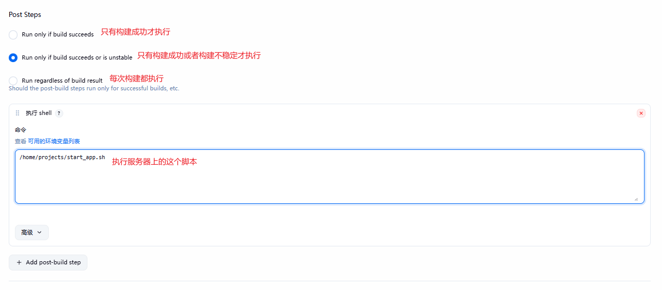 设置构建完执行这个脚本,如下,