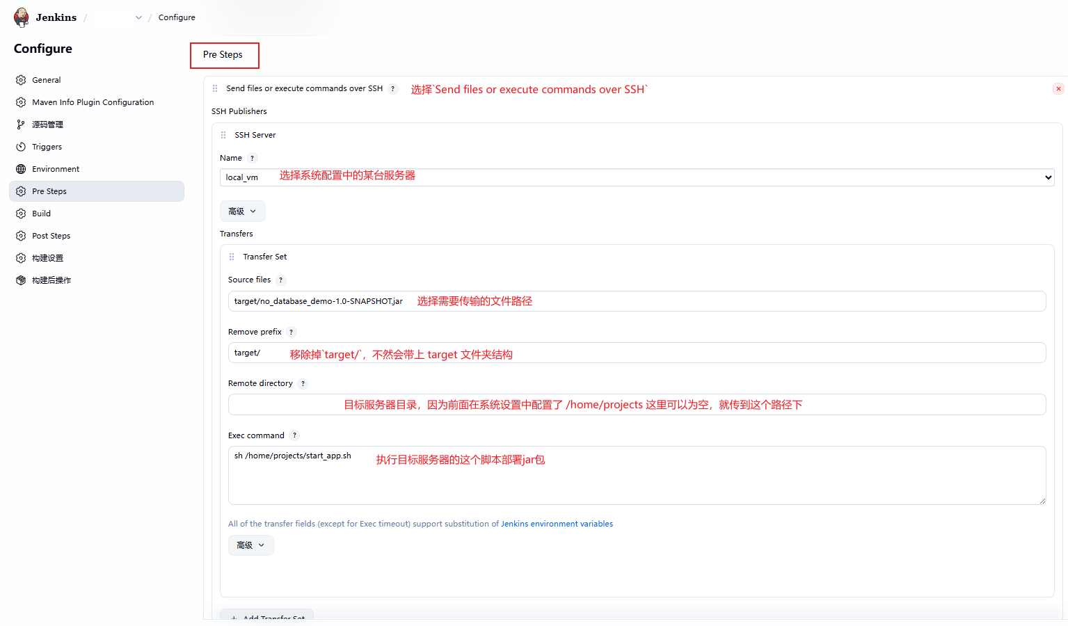 第二步,在需要跨服务器构建的工程里,增加 Pre Steps 配置。