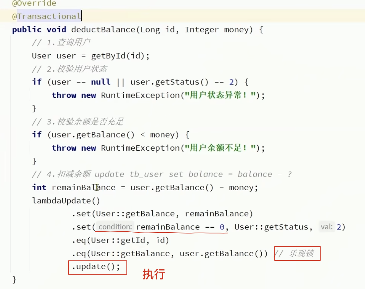 // 3. 更新时比较余额(乐观锁)