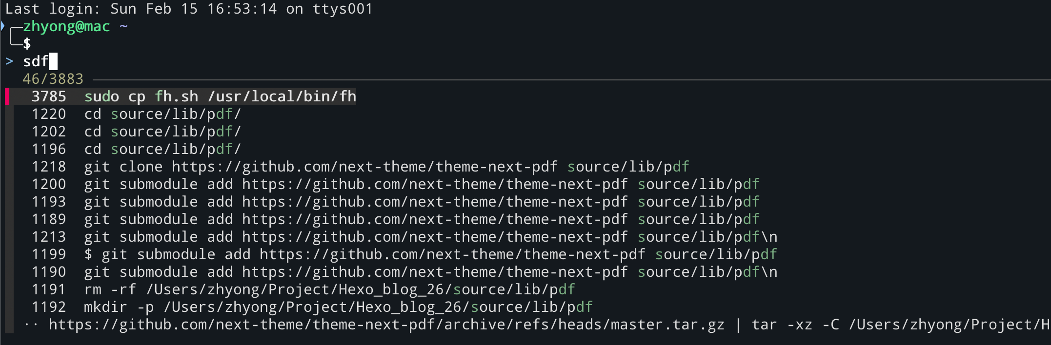 此时,只要在终端按下Ctrl+H键,马上即可跳出搜索框,配合fzf命令,体验非常好。