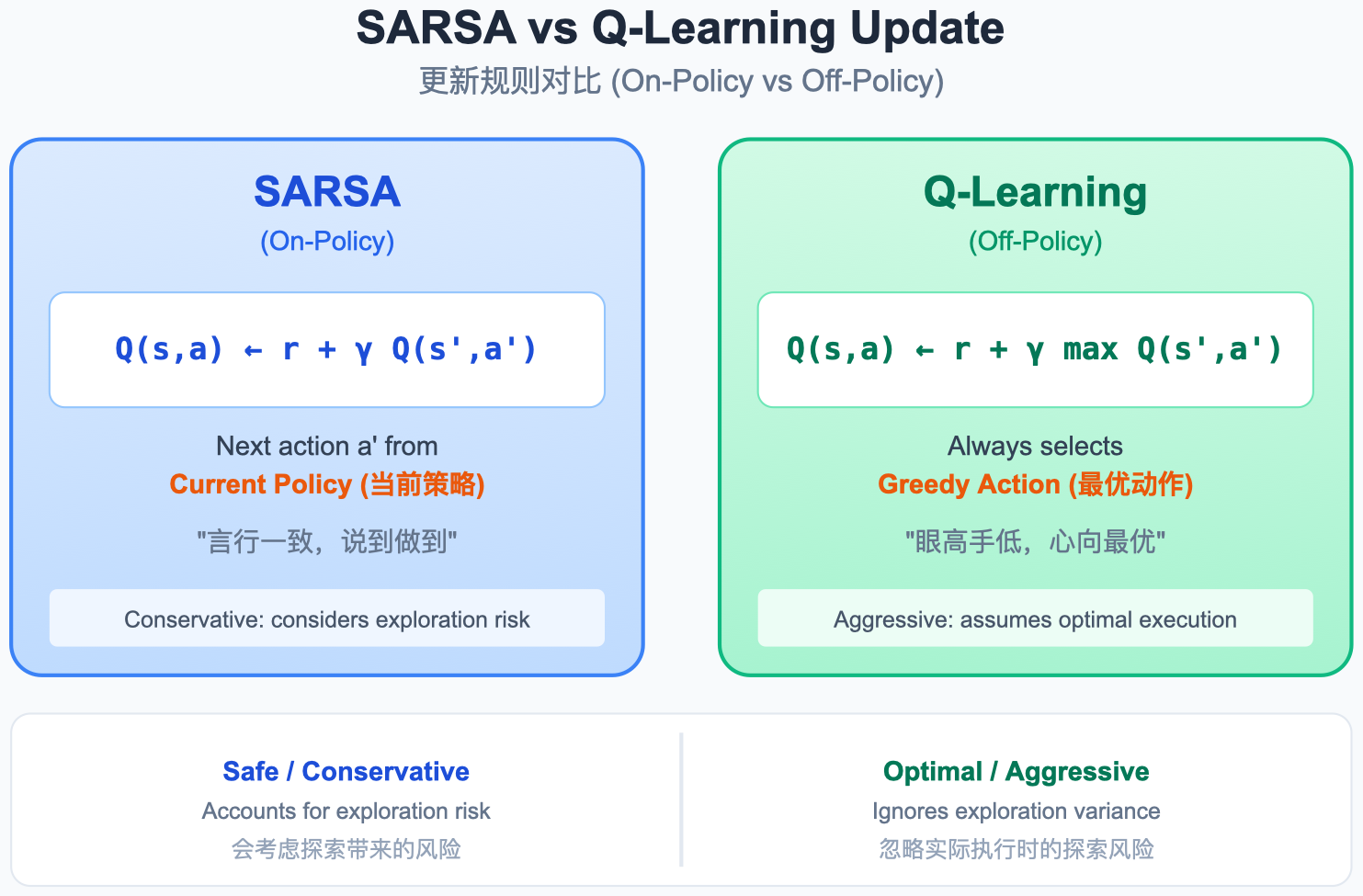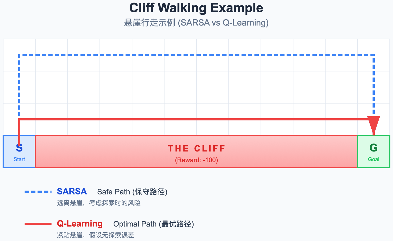- SARSA:On-policy TD 控制,学到的策略会把探索的风险考虑在内,更"谨慎"。