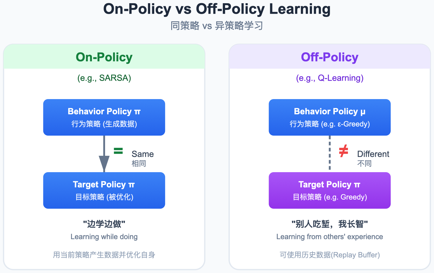 - On-policy vs Off-policy:行为策略和目标策略是否是同一个,决定了算法的风格和适用场景。