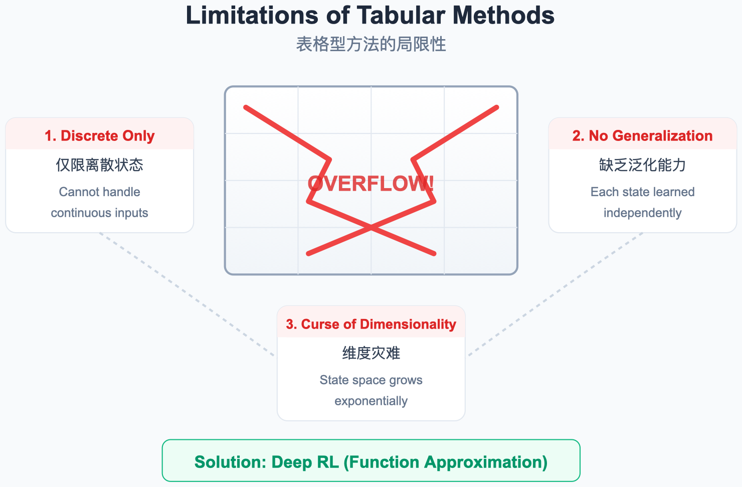 表格型方法在大规模或连续状态空间下彻底失效。下一章我们进入深度价值学习,看 DQN 如何用神经网络逼近 Q 函数,以及它背后的核心创新。