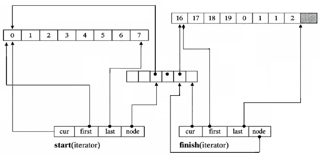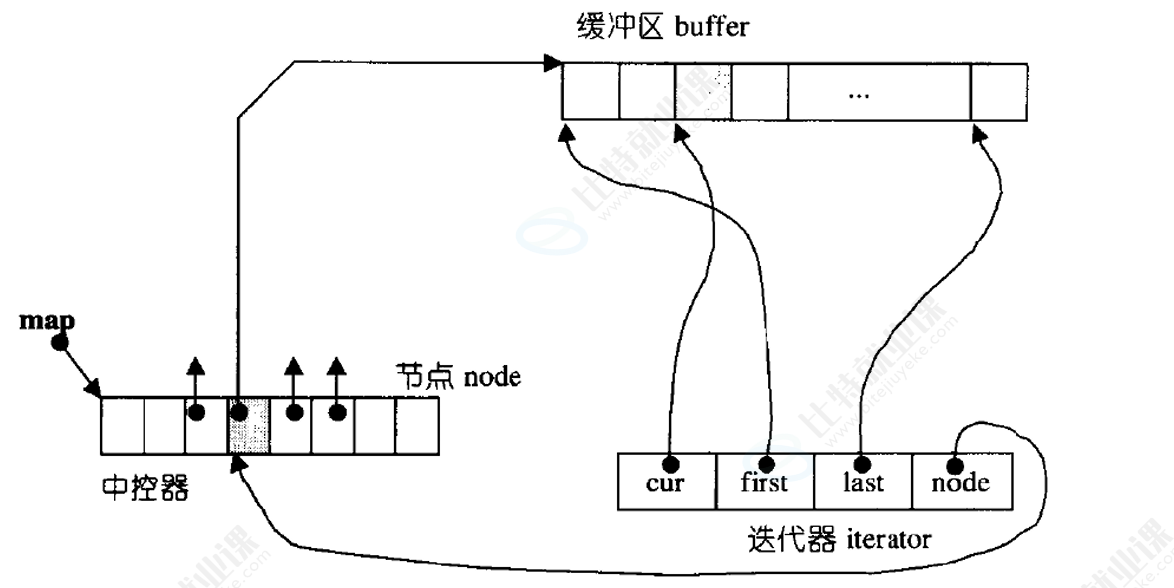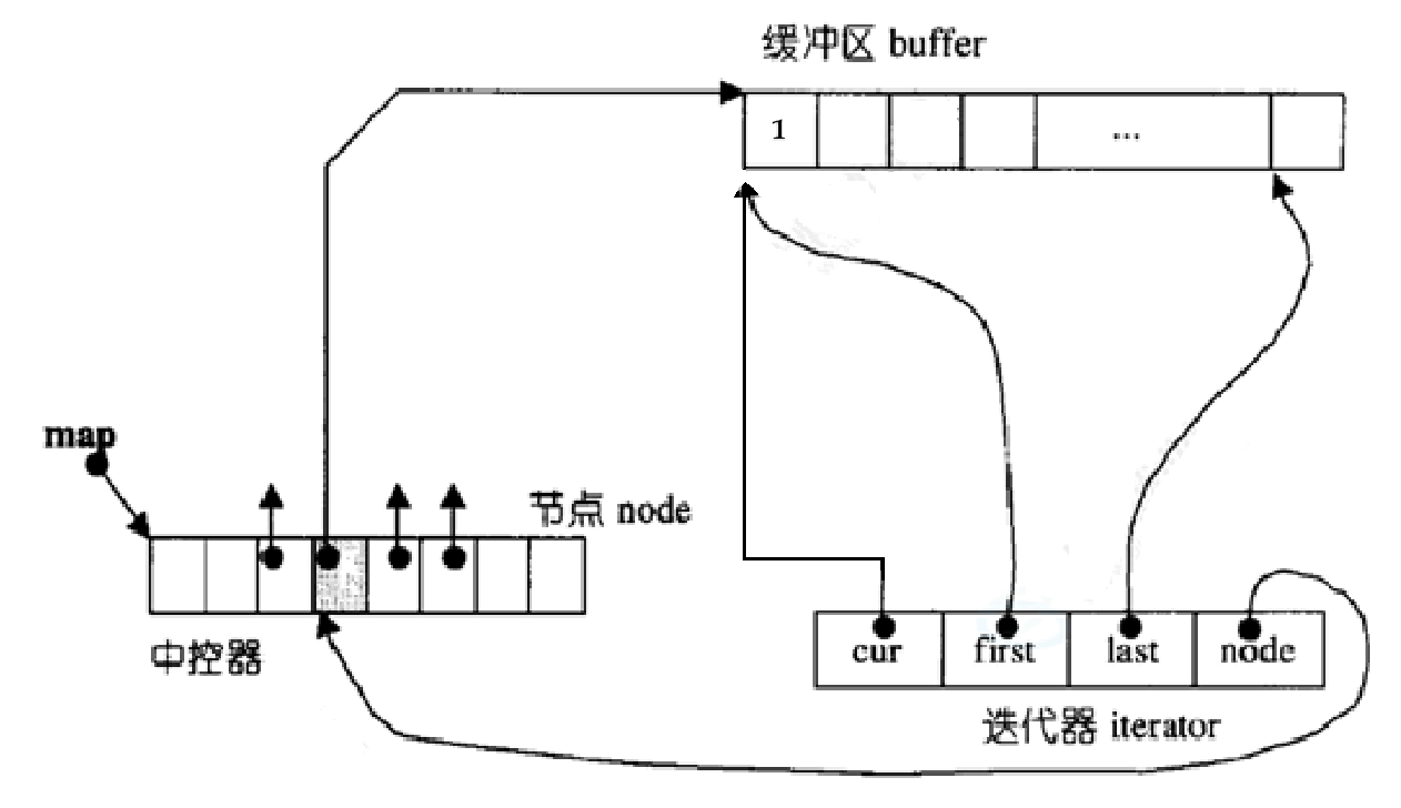 deque的底层由buffer数组,中控数组,迭代器三大组件构成。如下图,中控数组是一个指针数组,buffer数组是一个存储实际数据的数组,迭代器由四个指针构成。