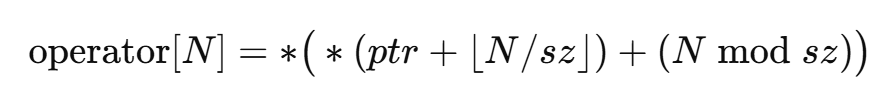 如何完成上面这两步:首先假设要得到第N个数据,每一个buffer的大小是sz。 N/sz确定在中控数组的哪里,N%sz确定在这个buffer的哪里。得到以下公式: