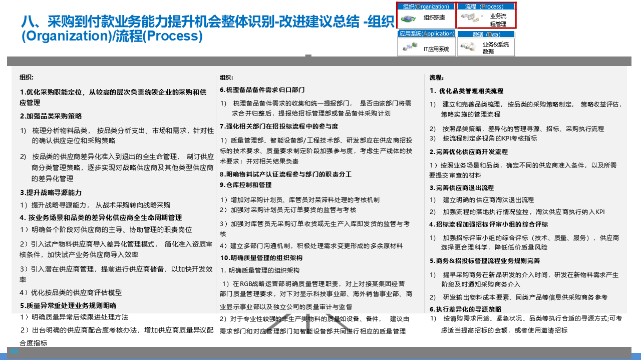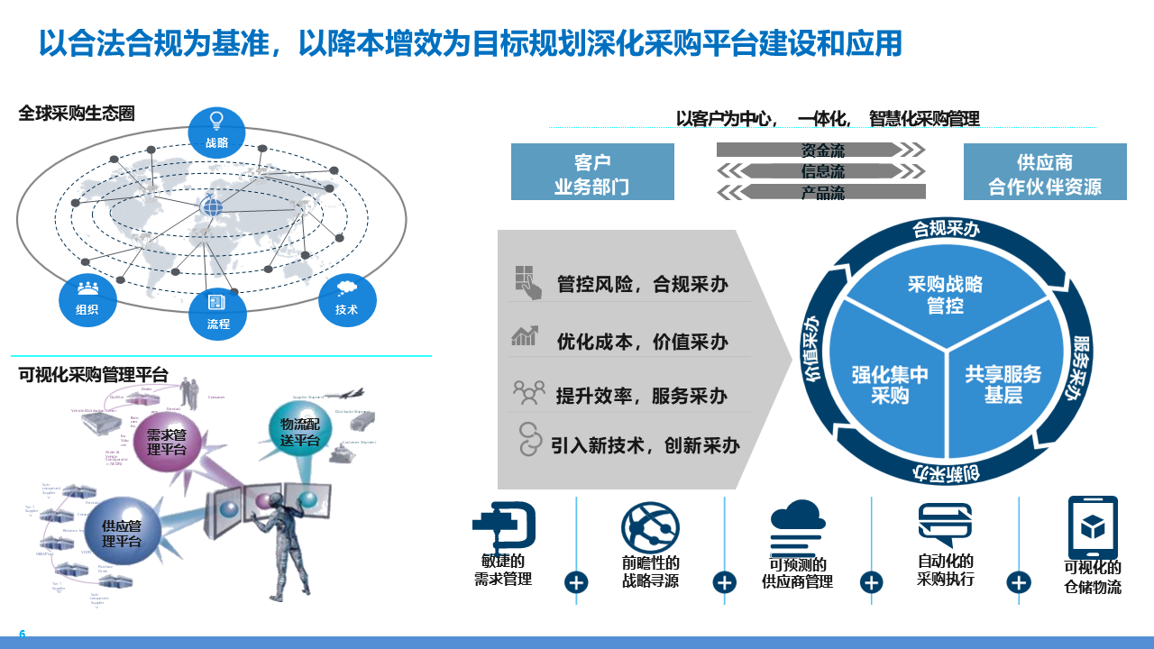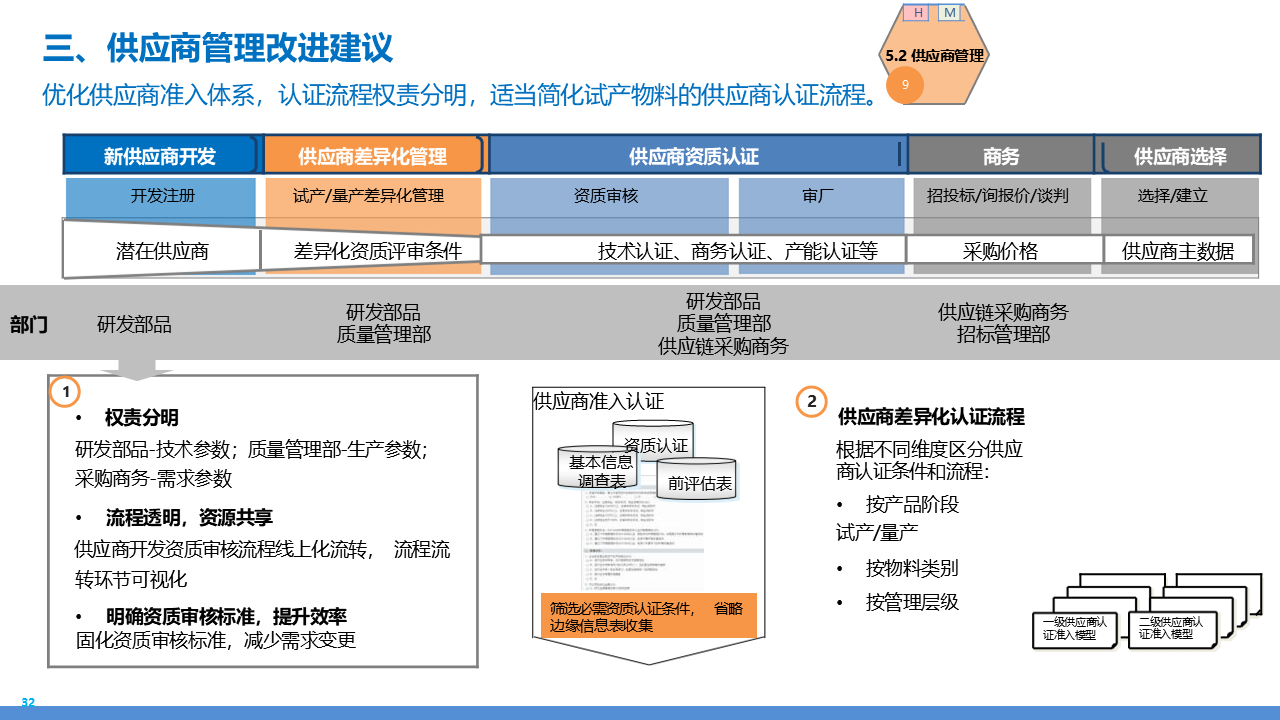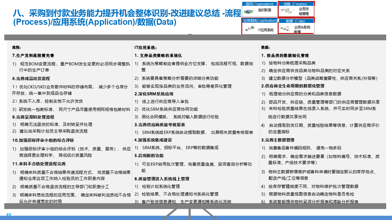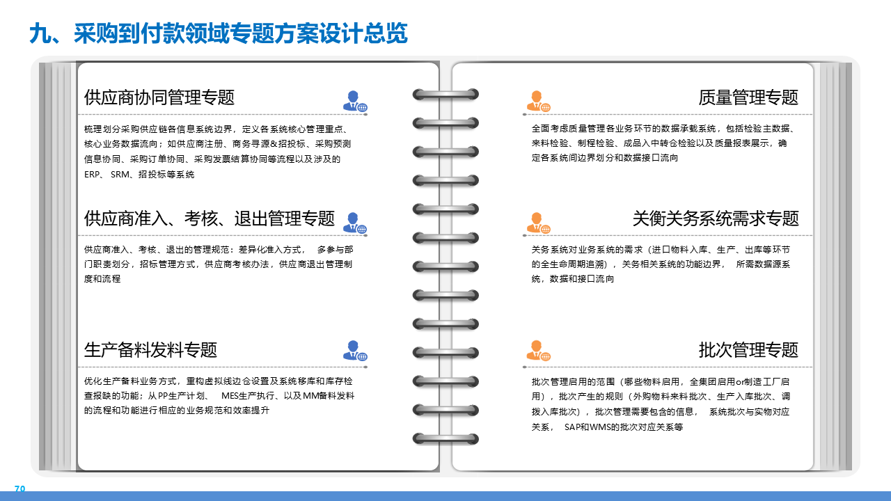 适应人群为企业采购管理人员、供应链负责人、数字化转型决策者、招投标专员及库存与质量管理从业者。主要内容围绕 IBM 企业数字化转型中的采购供应链业务流程展开,核心包括战略规划(从传统采购到集成采购再到智慧采购的演进路径,以 "低成本、高齐套" 为目标);业务流程体系(涵盖策略制定、供应商管理、招投标、采购执行、库存管理、质量管理等模块,含 11 个二级流程和 81 个三级流程);痛点与改进(分析供应商管理、库存管控、质量追溯等环节的痛点,提出差异化寻源、供应商全生命周期管理、批次追踪、系统集成等解决方案);实施保障(通过组织架构优化、流程标准化、SRM/ERP 系统应用、数据驱动决策等支撑转型),为企业实现采购供应链的高效化、智能化、协同化提供全面指引。