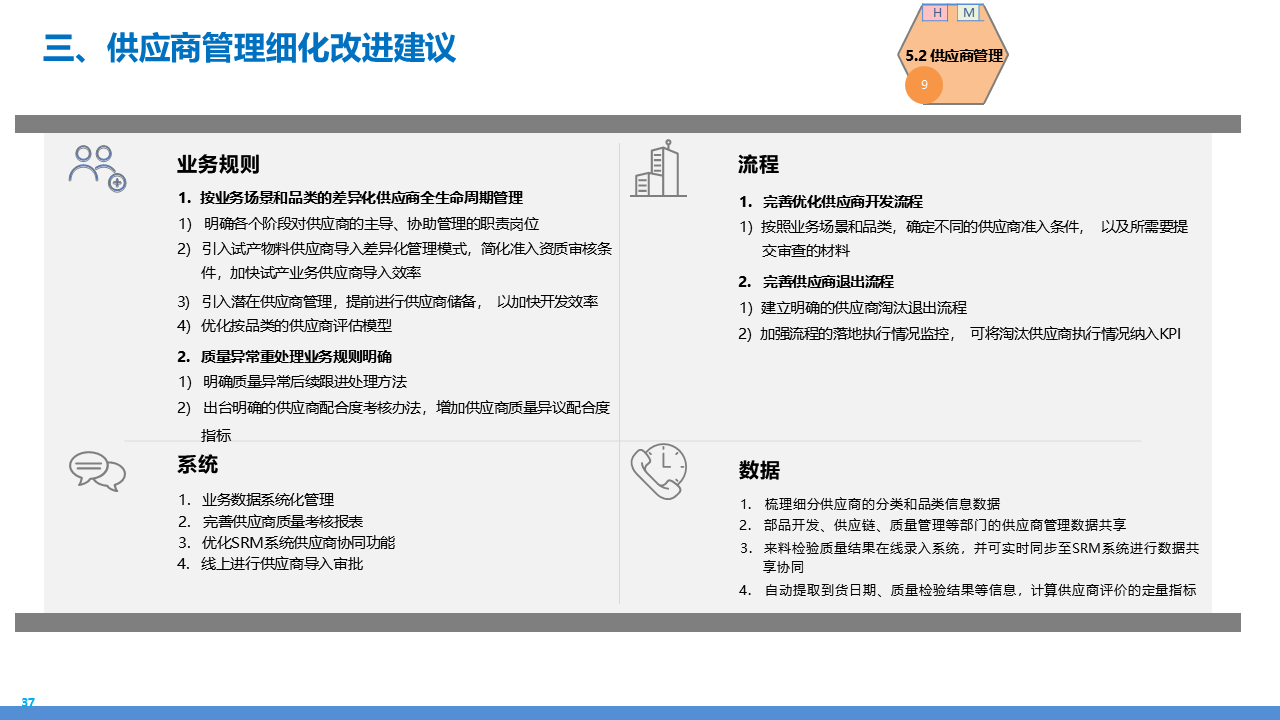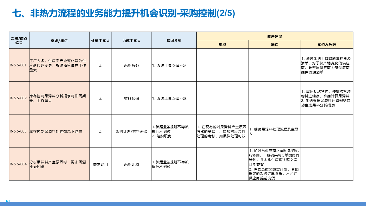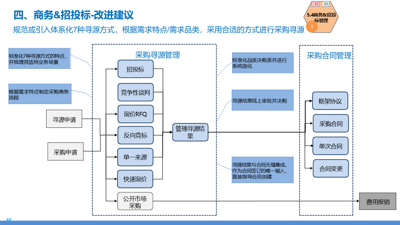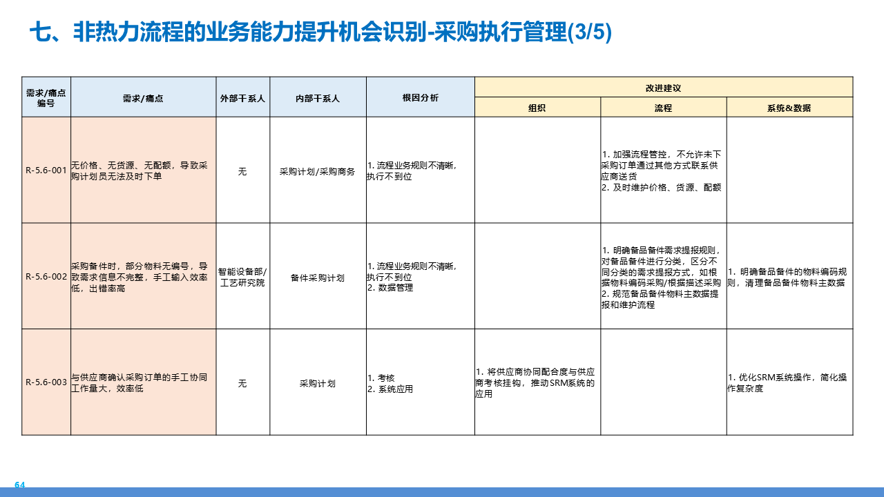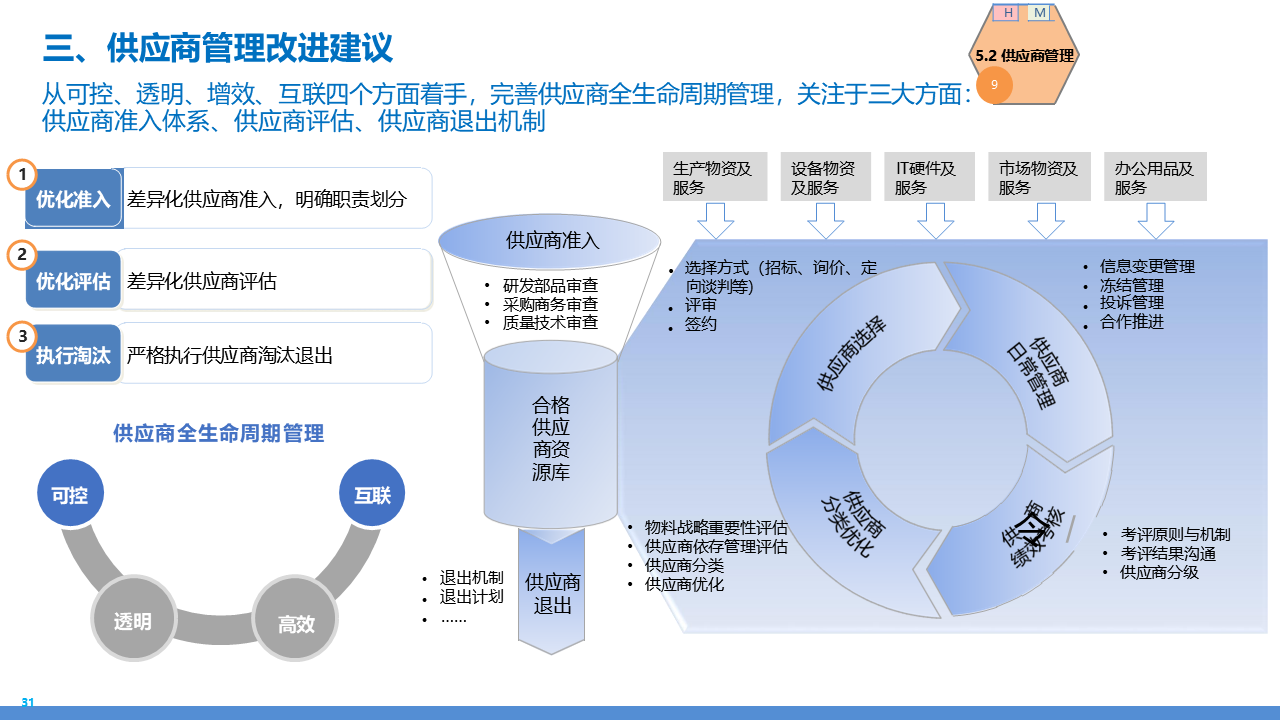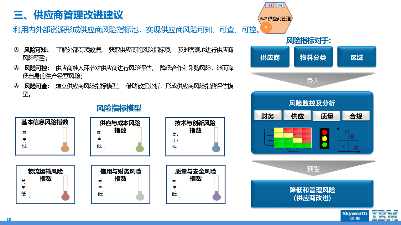 适应人群为企业采购管理人员、供应链负责人、数字化转型决策者、招投标专员及库存与质量管理从业者。主要内容围绕 IBM 企业数字化转型中的采购供应链业务流程展开,核心包括战略规划(从传统采购到集成采购再到智慧采购的演进路径,以 "低成本、高齐套" 为目标);业务流程体系(涵盖策略制定、供应商管理、招投标、采购执行、库存管理、质量管理等模块,含 11 个二级流程和 81 个三级流程);痛点与改进(分析供应商管理、库存管控、质量追溯等环节的痛点,提出差异化寻源、供应商全生命周期管理、批次追踪、系统集成等解决方案);实施保障(通过组织架构优化、流程标准化、SRM/ERP 系统应用、数据驱动决策等支撑转型),为企业实现采购供应链的高效化、智能化、协同化提供全面指引。