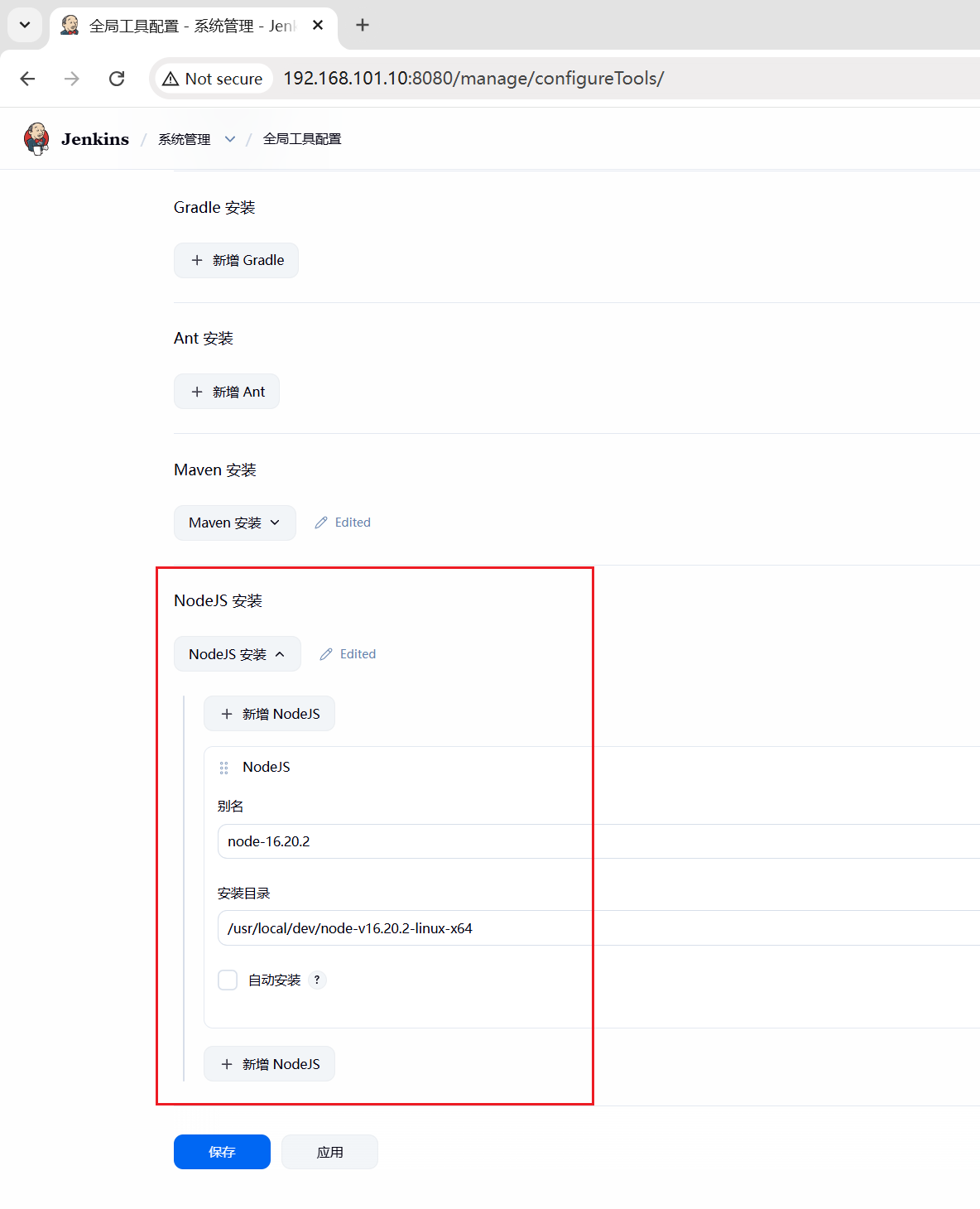 另外,Jenkins 中也支持设置 nodeJS 配置,但是不设置通过服务器的 Shell 命令也能完成部署。