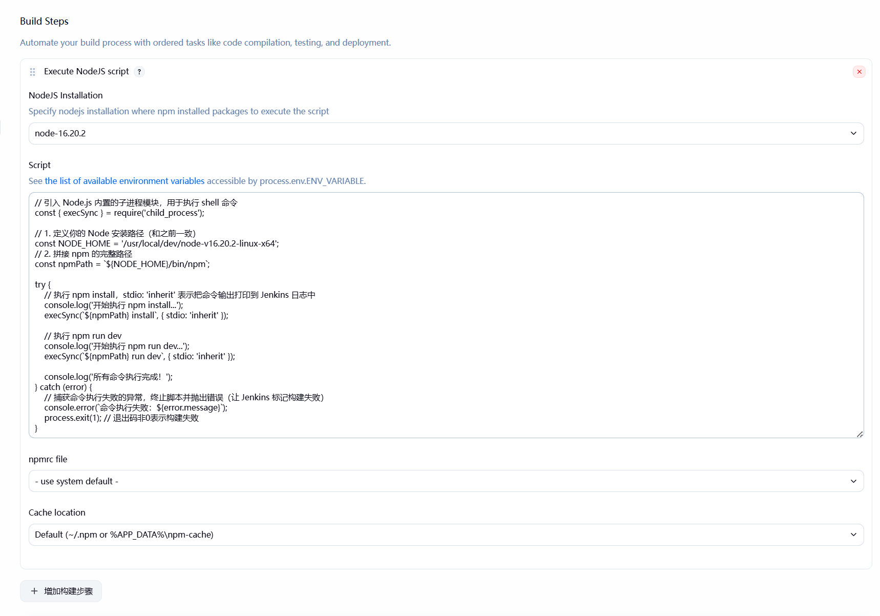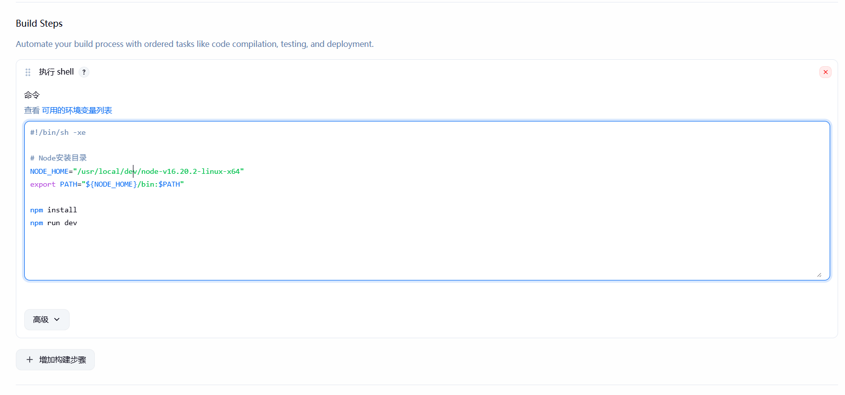 在 Build steps 中,写构建命令,前端构建用 node 命令。
