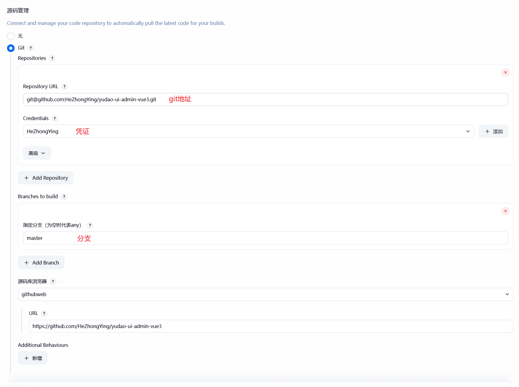 在任务的详细界面,配置 Git 仓库的地址、克隆代码的凭证,这点和部署后端项目一样。