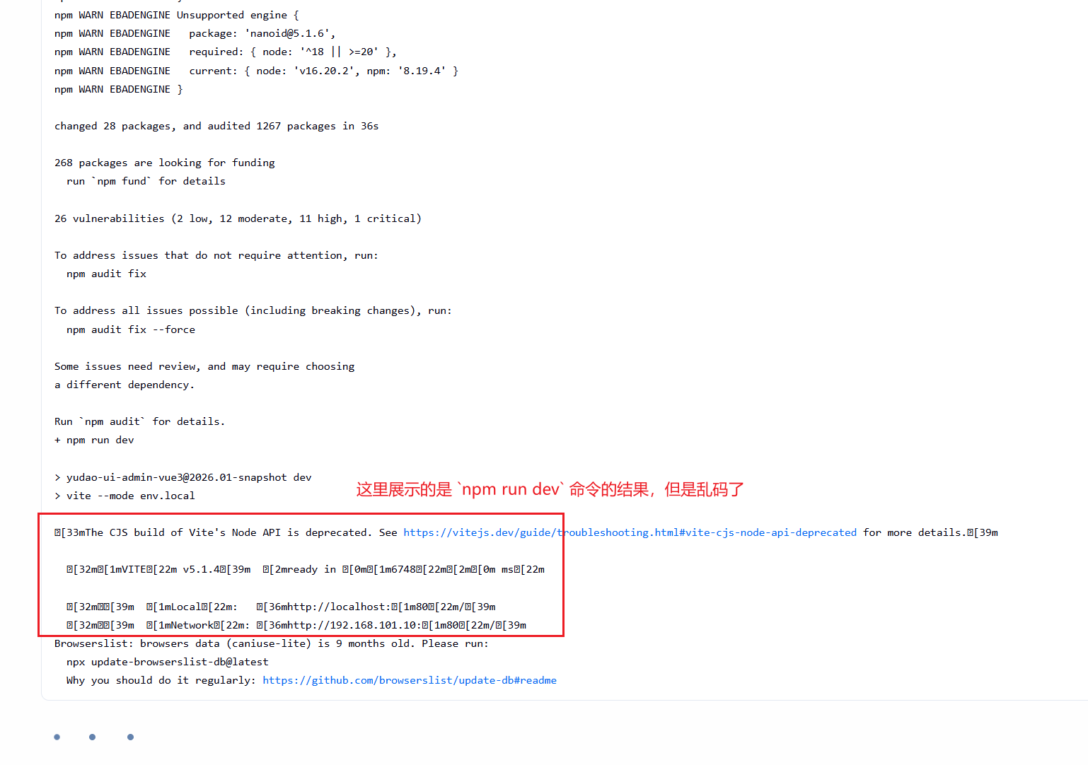 因为 CentOS7 安装 node16+ 版本十分困难(参看博客:CentOS 7安装Nodejs),我这里用 node16 演示,但该项目用这个版本又不能构建(npm run build 执行不了),所以用 npm run dev 代替。