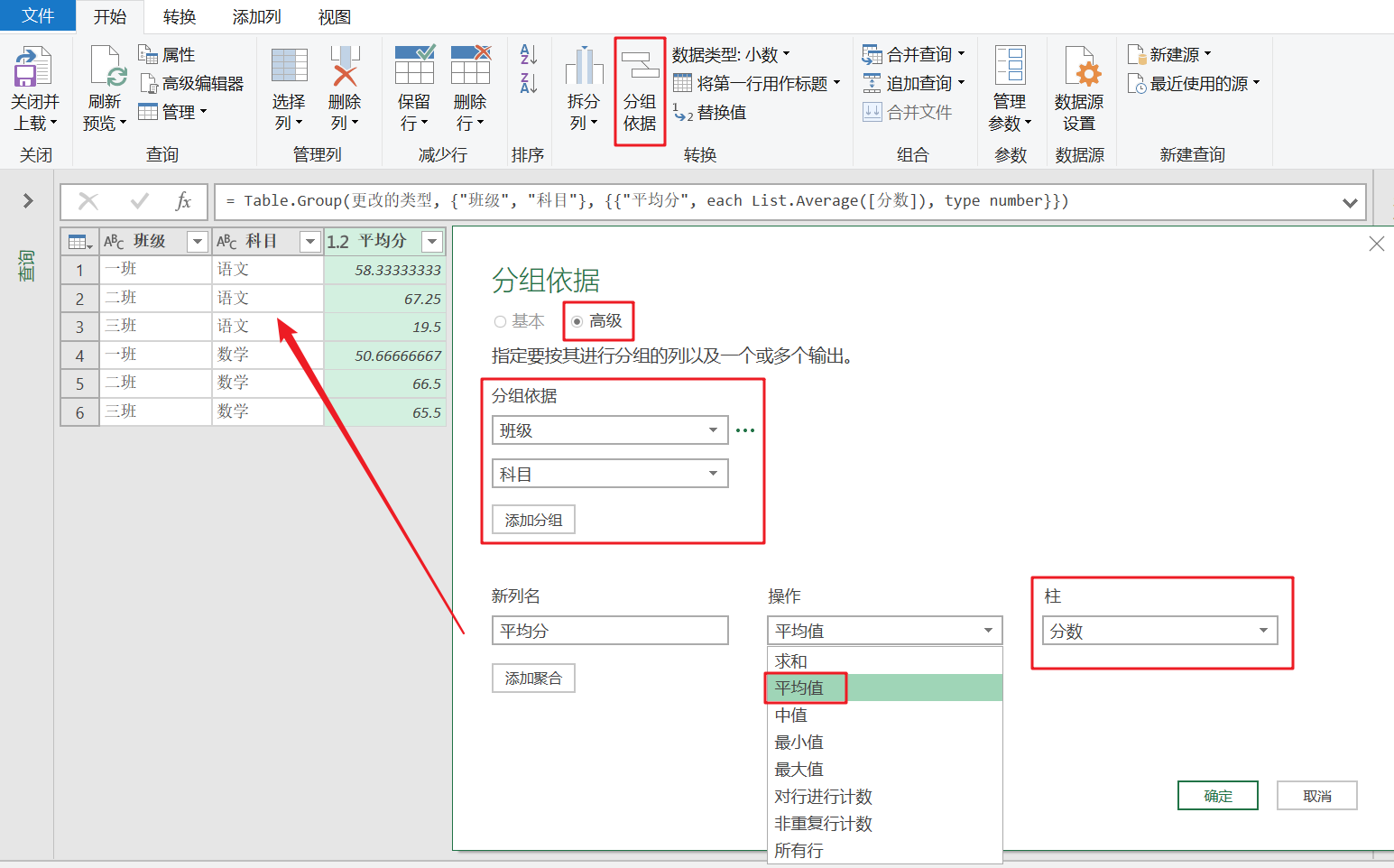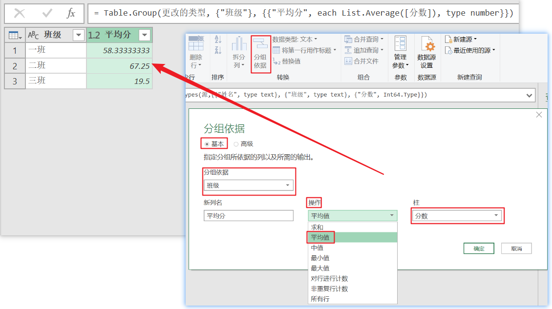 - 指定【分组依据】,【新列名】,【操作】等,即可完成分组统计。
