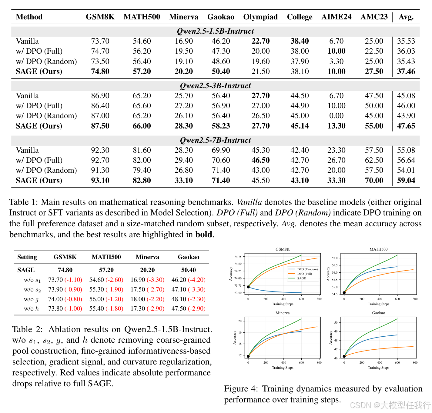 🔸SAGE在GSM8K至AIME24等8个数学推理基准上全面超越DPO全量/随机基线,平均准确率最高提升3.51%,验证其泛化有效性。