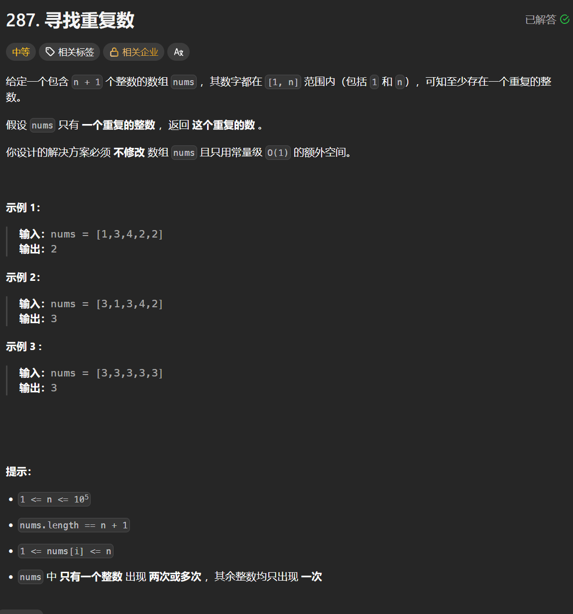 快慢指针的做法,根据条件,元素的大小是不超过数组的长度的,那么也就会,出现重复数意味着出现环 ,那么就是采取回环链表的做法