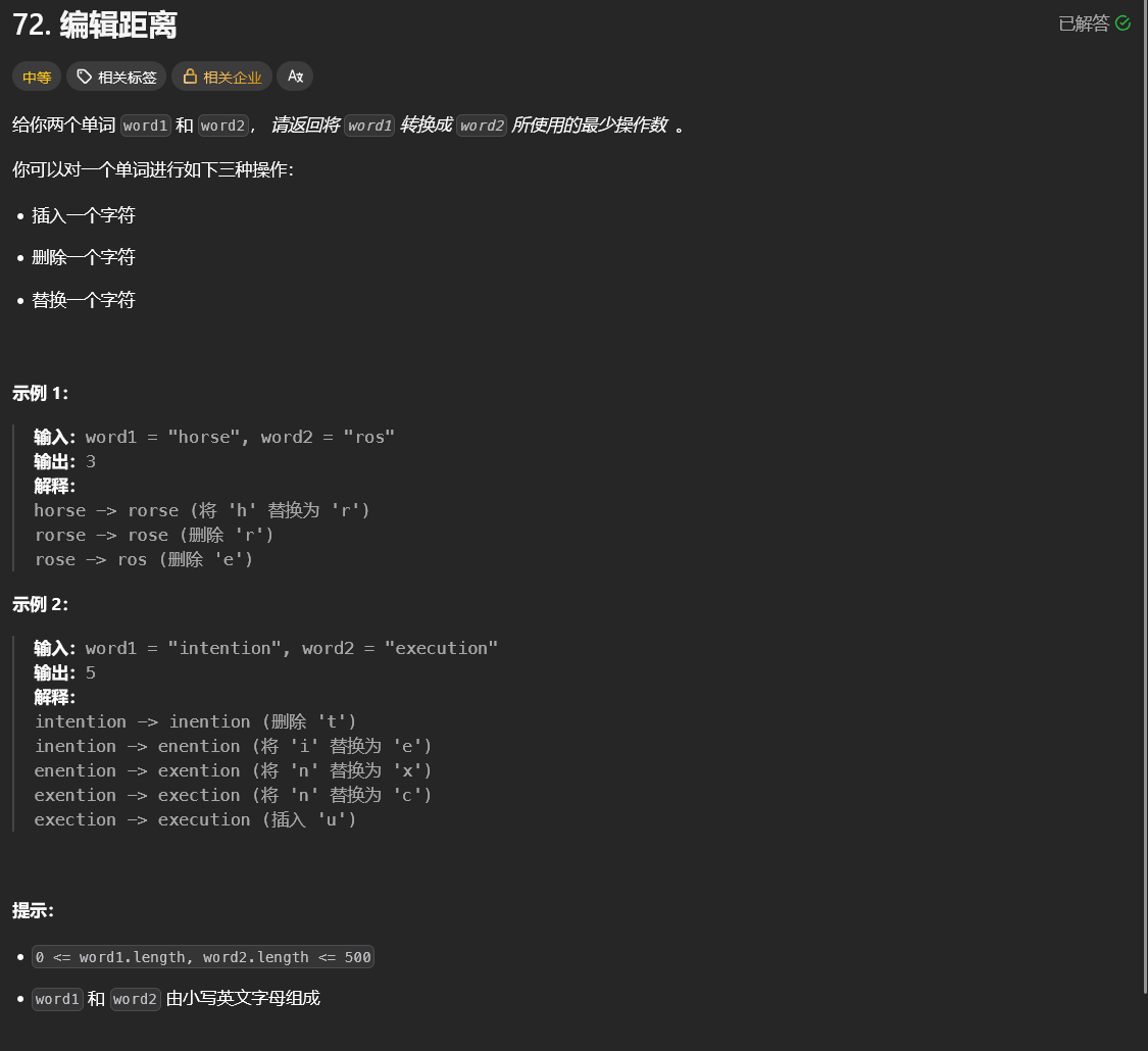 // dp[i][j-1]+1:在word1插入word2的第j个字符(操作数+1)