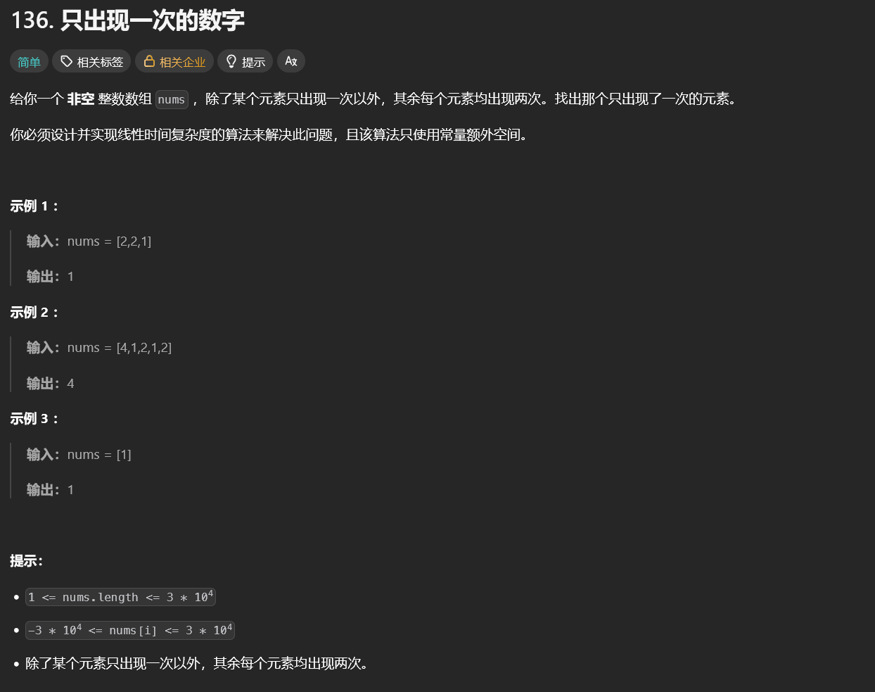 解法:两两异或,相同的会变成0,剩下的就是出现一次的