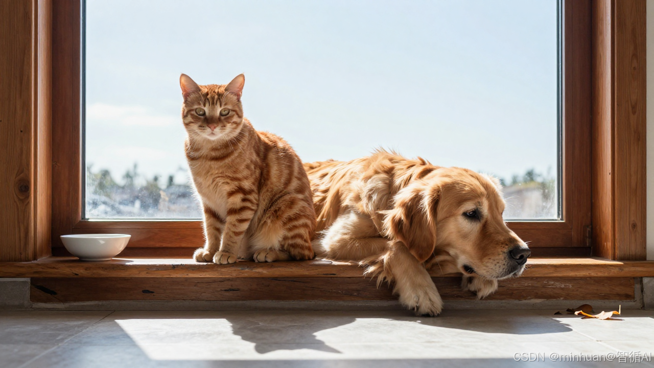 这张图片展示了一只猫和一只狗,它们坐在窗台上。猫坐在窗台上,而狗则躺在窗台上。猫的毛色是橙色的,有黑色的条纹,它的眼睛是绿色的。狗的毛色是 金色的,它的眼睛是黑色的。猫和狗都背向窗户,窗台上有一个白色的碗,里面装着食物。窗台是木制的,窗户是木制的,背景是蓝 色的天空。