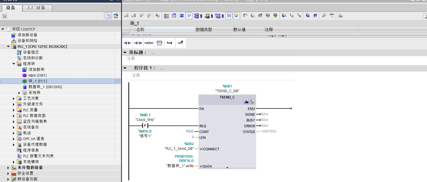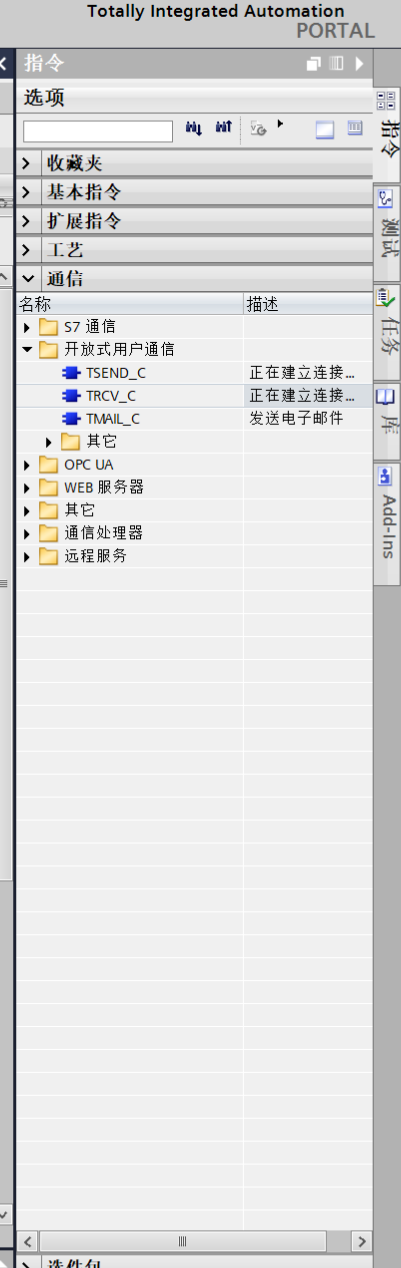 块创建成功之后添加通信指令TSEND_C"正在建立和连接数据"