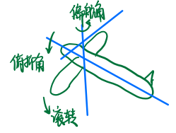 欧拉角: 欧拉角是飞机机身相当于初始3个轴的夹角,飞机机头下倾\上仰,这个轴的夹角俯仰。飞机机身左翻\右翻叫做滚转。飞机机身保持水平,机头向左转或者右转叫作偏航。