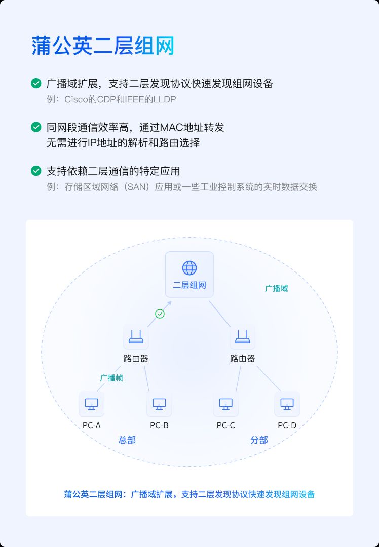 同时,还可借助蒲公英自研二层组网能力,实现数据链路层以上协议直接远程互访,无需对工业协议进行转换;并可通过蒲公英的云DHCP机制化解IP冲突难题,降低网络配置成本。