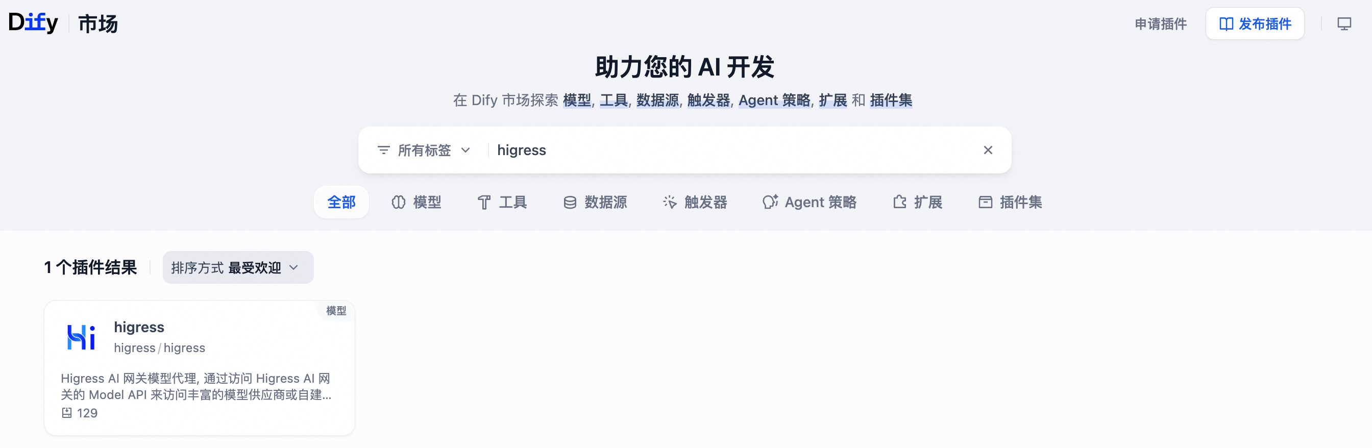 开发者在 Dify 插件市场搜索 higress 即可获取对应插件并安装。