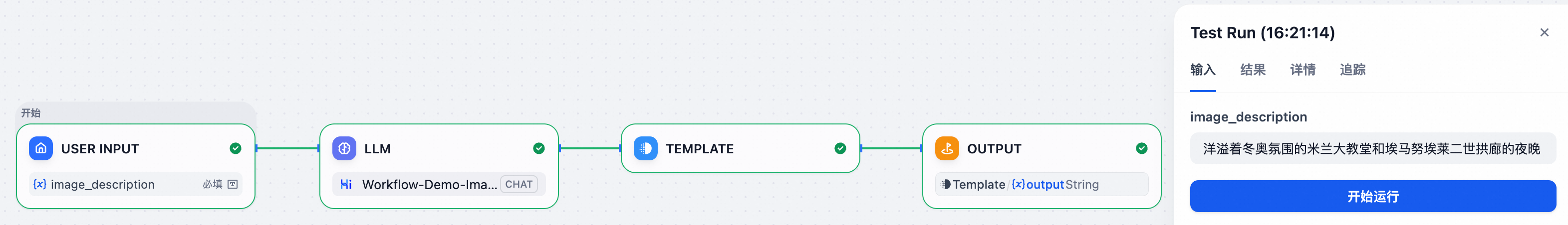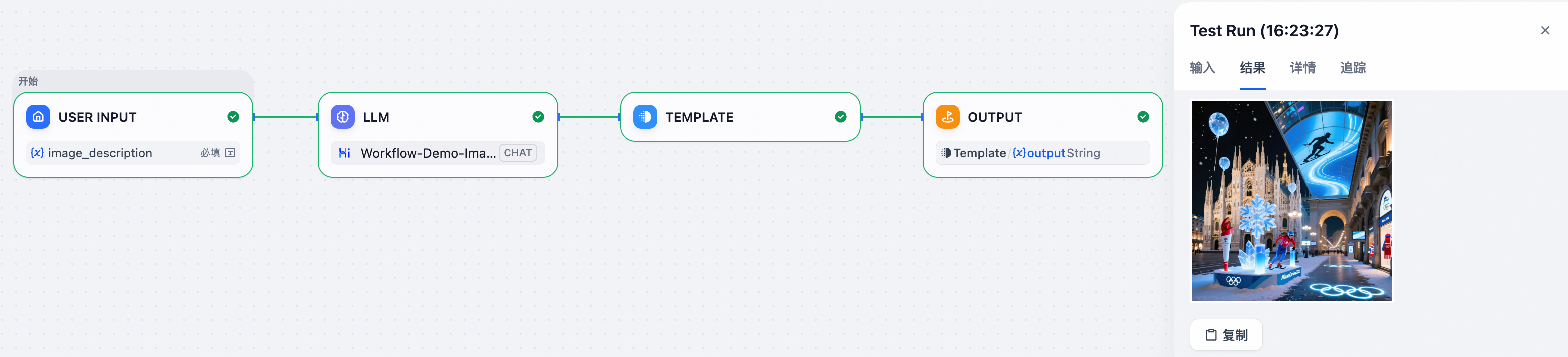 本 Demo 的流程如下图所示,模型节点中的模型使用上述步骤创建的模型,用户输入的图片描述作为模型节点的 user prompt,生成图片的 url 在模型节点的 text 信息中返回,使用模版转换节点将返回结果转换为 markdown 格式,方便在输出节点中直接展示图片结果。