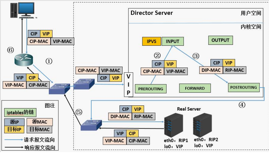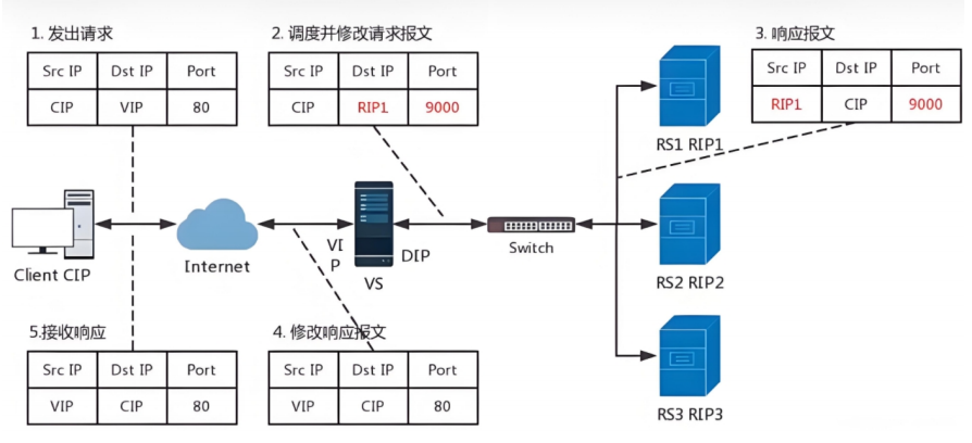 本质是多目标IP的DNAT,通过将请求报文中的目标地址 和目标端口 修改为某挑出的RS的RIP 和PORT实现转发。