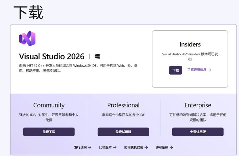 Visual Studio 2026 分别提供了社区版(免费)、专业版(付费)、企业版(付费),可以根据需求选择下载。