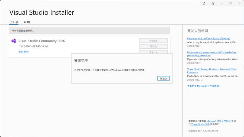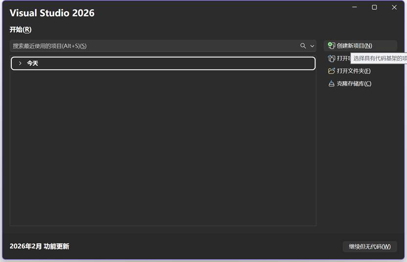 4.安装完毕后可启动 Visual Studio 2026。可根据提示使用微软帐号和github帐号进行登录,登录后可进行新项目的创建。