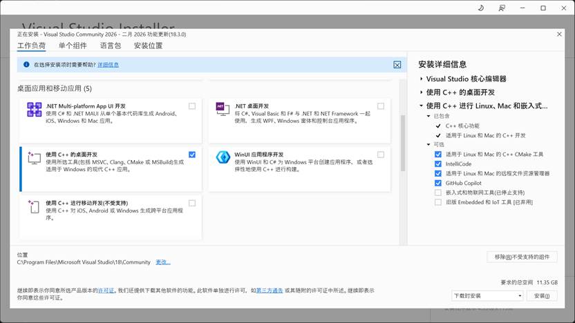 3.选择自己所需组件,可以通过选择所需的工作负载来使用该程序自定义安装(假如之后有对应的工作负荷改变还是可以重新勾选安装)。