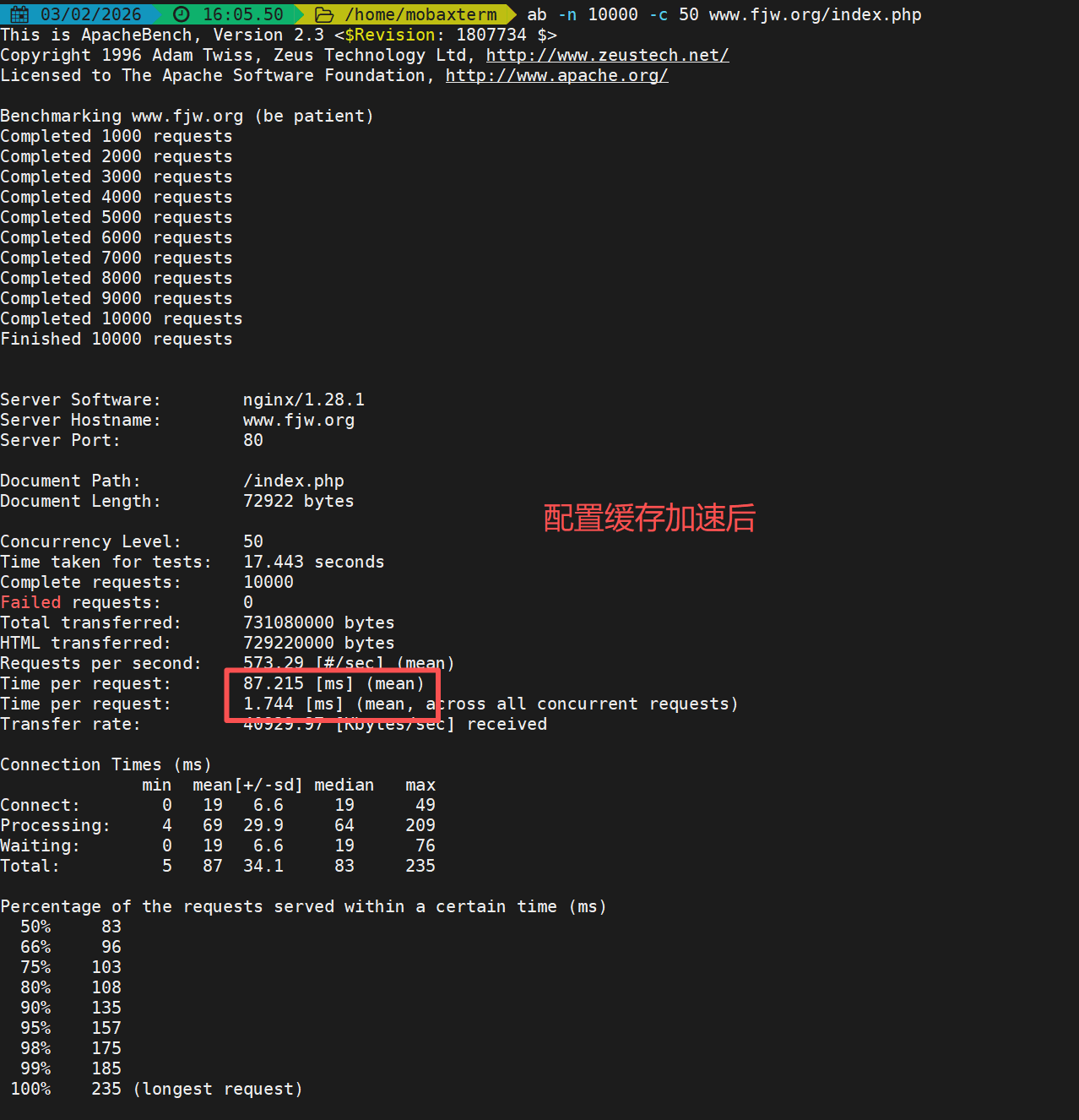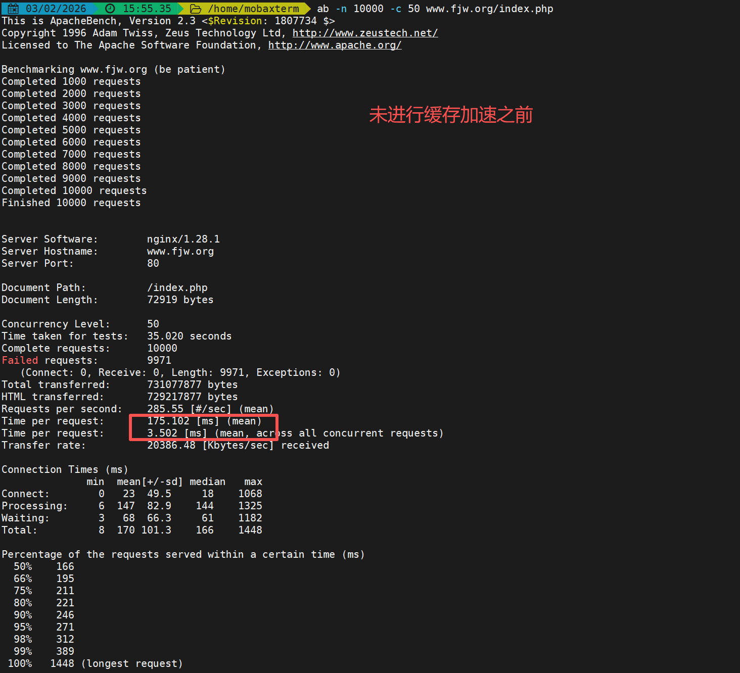 [root@nginx ~]# ab -n 1000 -c 200 php.fjw.org/example.php #连接缓存的文件