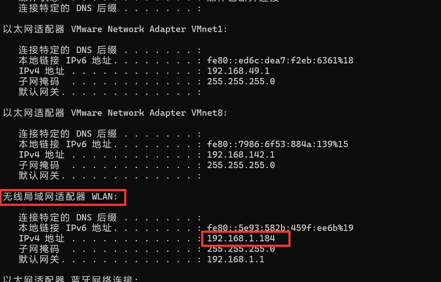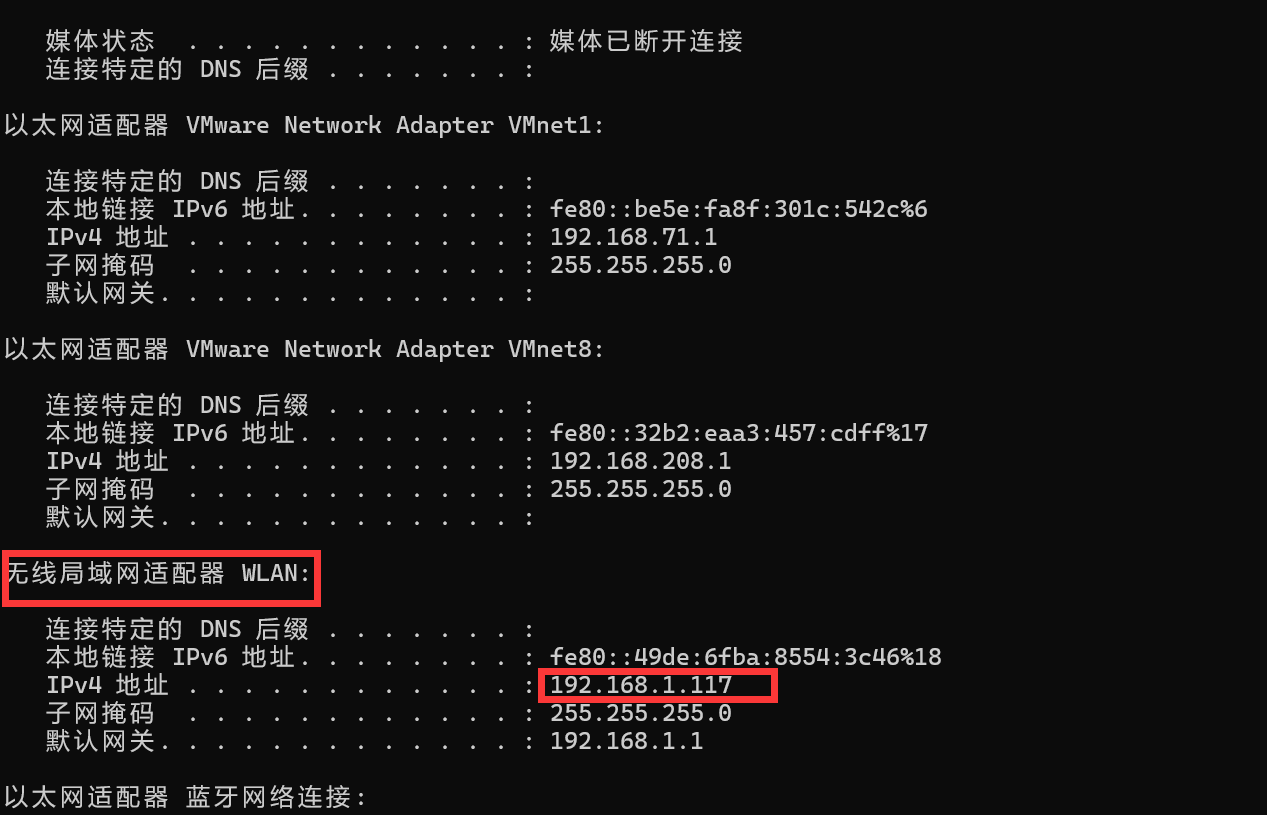 提供ipconfig查询ip(查看无线局域网的ip)
