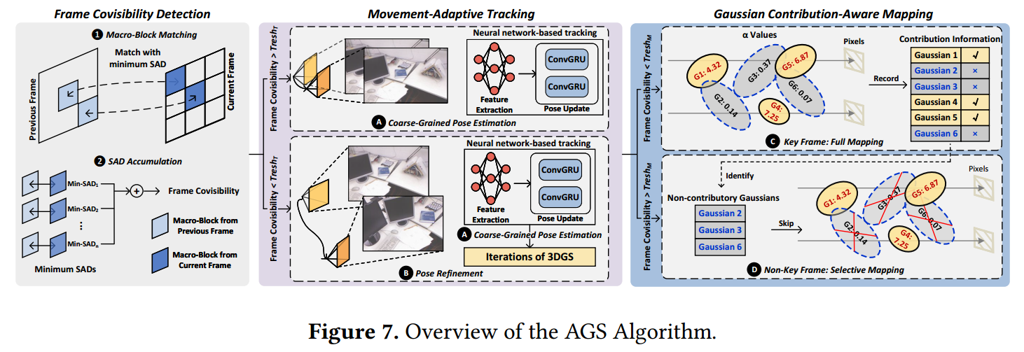 在此过程中,我们将所有帧分类为关键帧和非关键帧:对于关键帧,我们运行完整建图(图7中的C),执行基线3DGS算法来记录贡献信息。对于非关键帧,我们重复使用记录的信息来执行选择性建图(D),跳过非贡献高斯以加速。