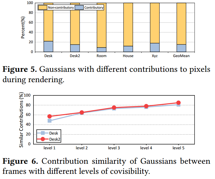 观察结果:跳过非贡献高斯的计算的机会。由于大部分高斯对像素颜色没有影响,一个可行的解决方案是在运行时以最小的开销识别并跳过那些非贡献高斯的计算。幸运的是,我们观察到高斯的贡献在具有高共视性的帧中是相似的。我们将FC分为五个级别,其中级别越高表示与前一帧的共视性越高。结果显示,在具有级别5 FC的帧中,来自帧的80%以上的非贡献高斯噪声被消除。前一帧在当前帧中保持非贡献。这为我们提供了在来自前一帧的信息的指导下预测和跳过非贡献高斯的计算的机会。